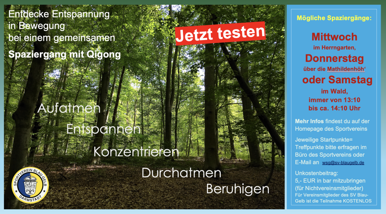 Die Qigong-Spaziergänge starten ebenfalls in der ersten Februarwoche 2026. Es geht los am Mittwoch im Herrngarten, am Donnerstag auf der Mathildenhöh‘ und am Samstag im Wald. Auch hier kannst du dich gerne vorab per E-Mail anmelden.